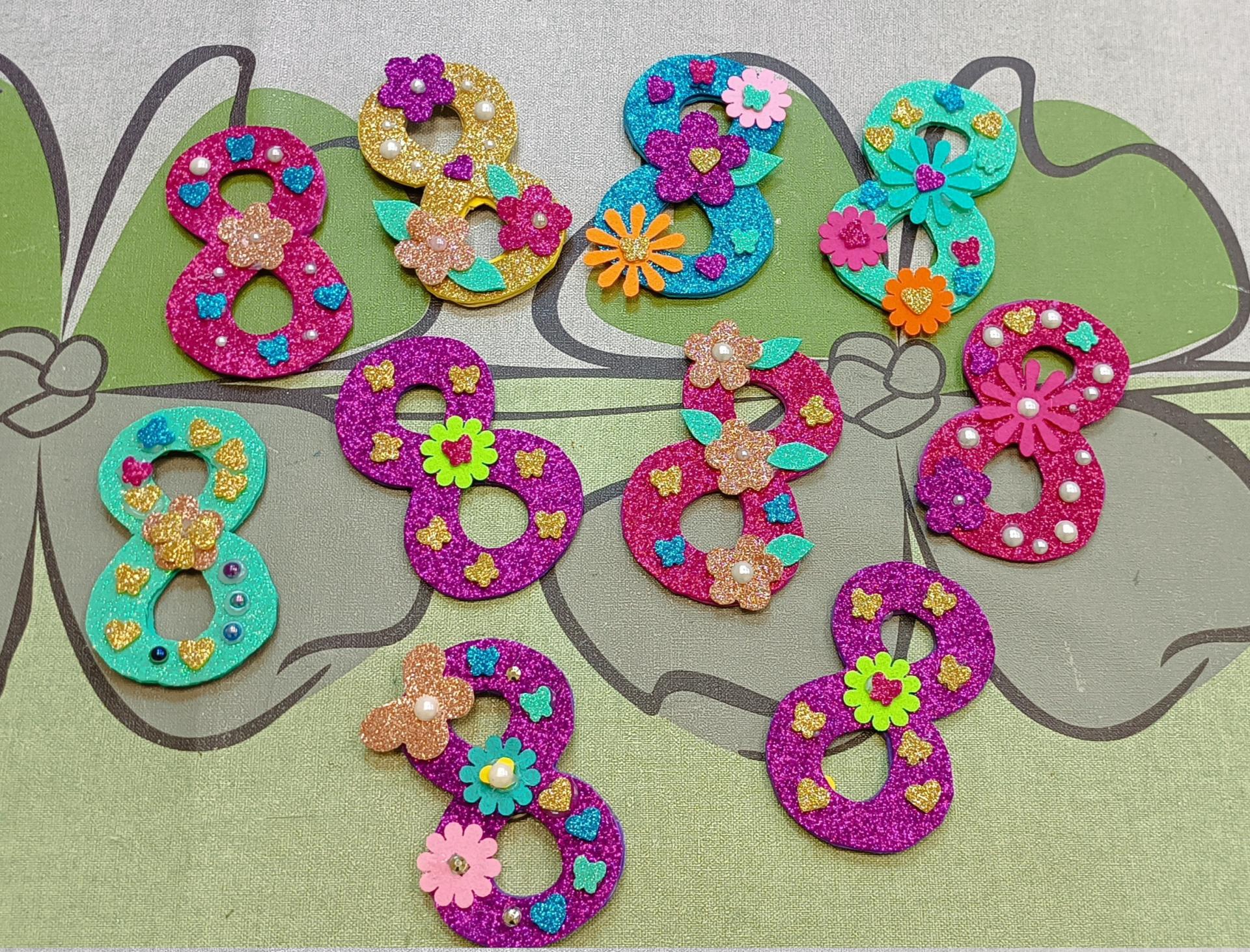 В начале занятия ребята посмотрели видеоролик об истории данного праздника, а затем, приготовив всё самое необходимое, дети принялись за работу. Из глитерного фоамирана ребята вырезали цифры восемь, склеивали их между собой, а для декорирования использовали различные украшения: цветы, листочки, бабочки, бусины. Получились очень красивые и яркие магниты, которые станут прекрасным подарком для мам, бабушек и сестричек.